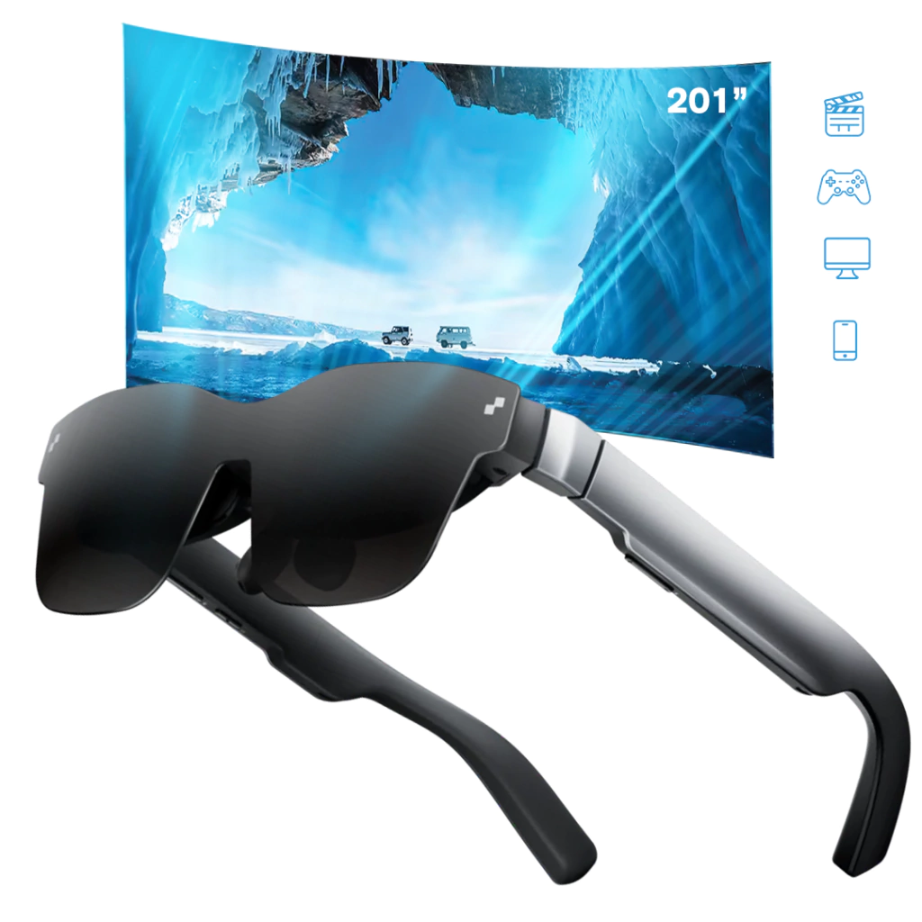 Ao colocar os óculos, você enxerga uma tela virtual de 201” (como se estivesse a 6 metros de distância), com 120Hz reais e áudio privado.